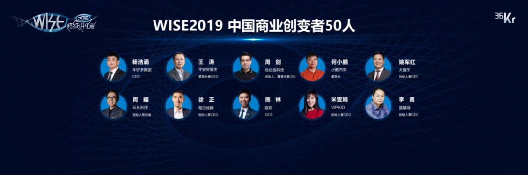 7月9日,在今天举行的“2019 WISE超级进化者大会”上,36氪发布“WISE 2019中国商业创变者50人”榜单,字节跳动张一鸣、美团点评王兴、大搜车姚军红等行业引领者成功入选。